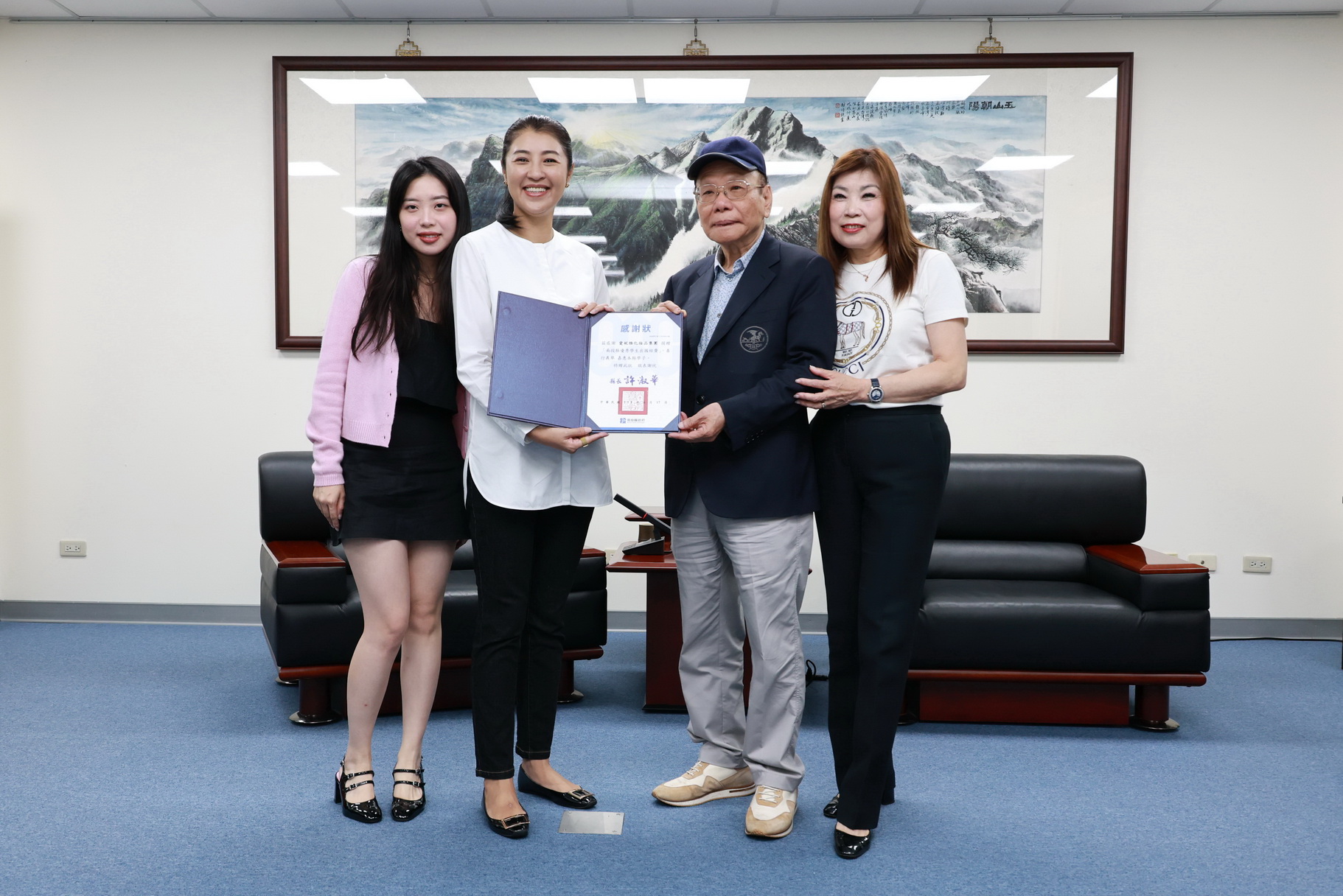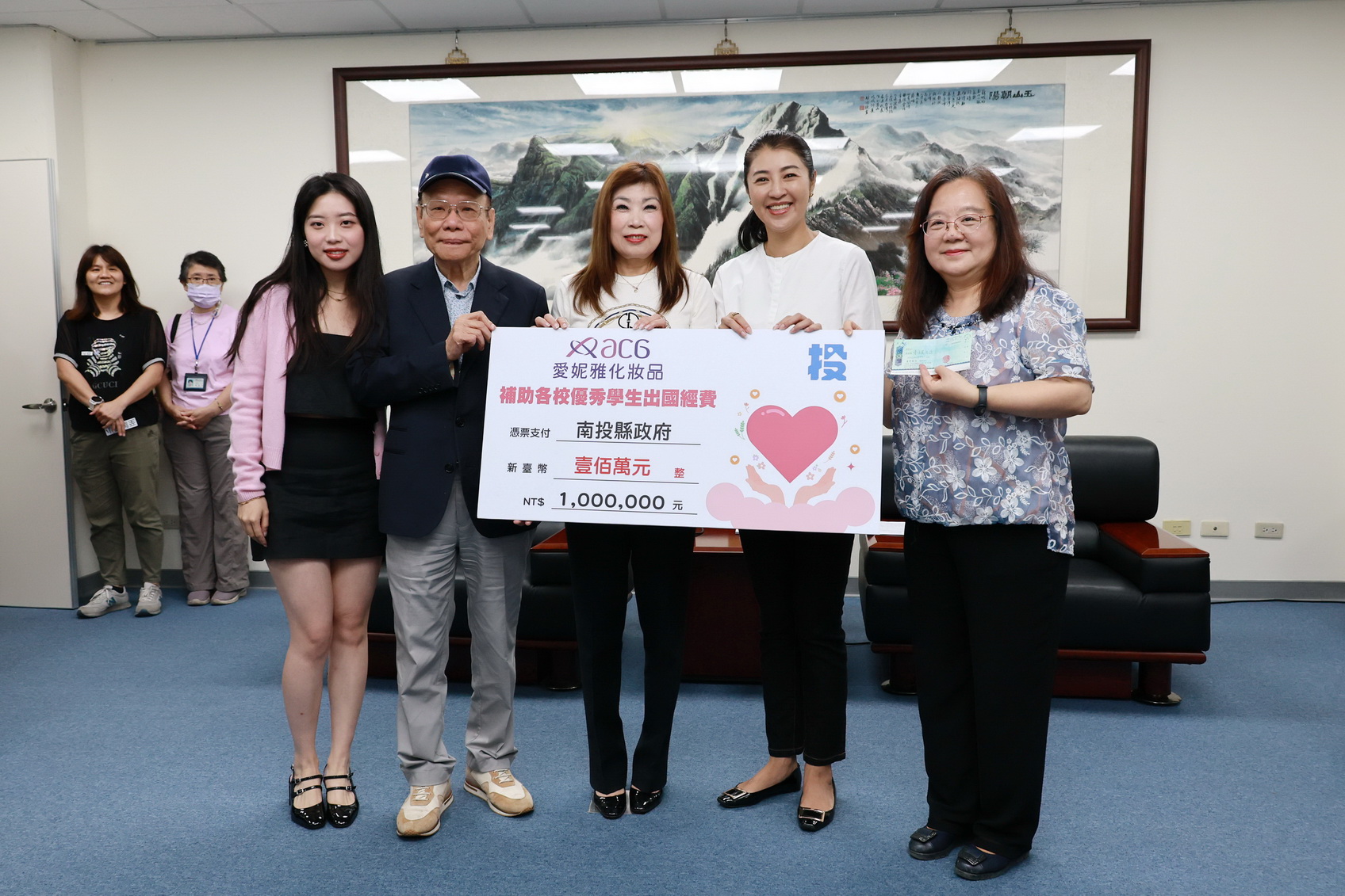 為補助本縣優秀學生出國經費,開拓國際視野,愛妮雅化妝品集團公司、COCO都可茶飲公司響應縣長許淑華號召,合計捐贈新臺幣140萬元給縣府,作為補助南投縣的優秀學生出國比賽或交流的經費,以減輕學生的負擔,17日上午在縣長會客室隆重舉行捐贈儀式,由民和國中及中寮鄉至誠國小代表受贈,許縣長除肯定2校學生優異表現,並預祝此次出國参賽,順利成功,載譽歸國外,也頒贈感謝狀給愛妮雅化妝品集團陳威中總裁,COCO都可茶飲公司雖不克出席,許縣長也誠摯表達感謝之意,儀式簡單隆重。
