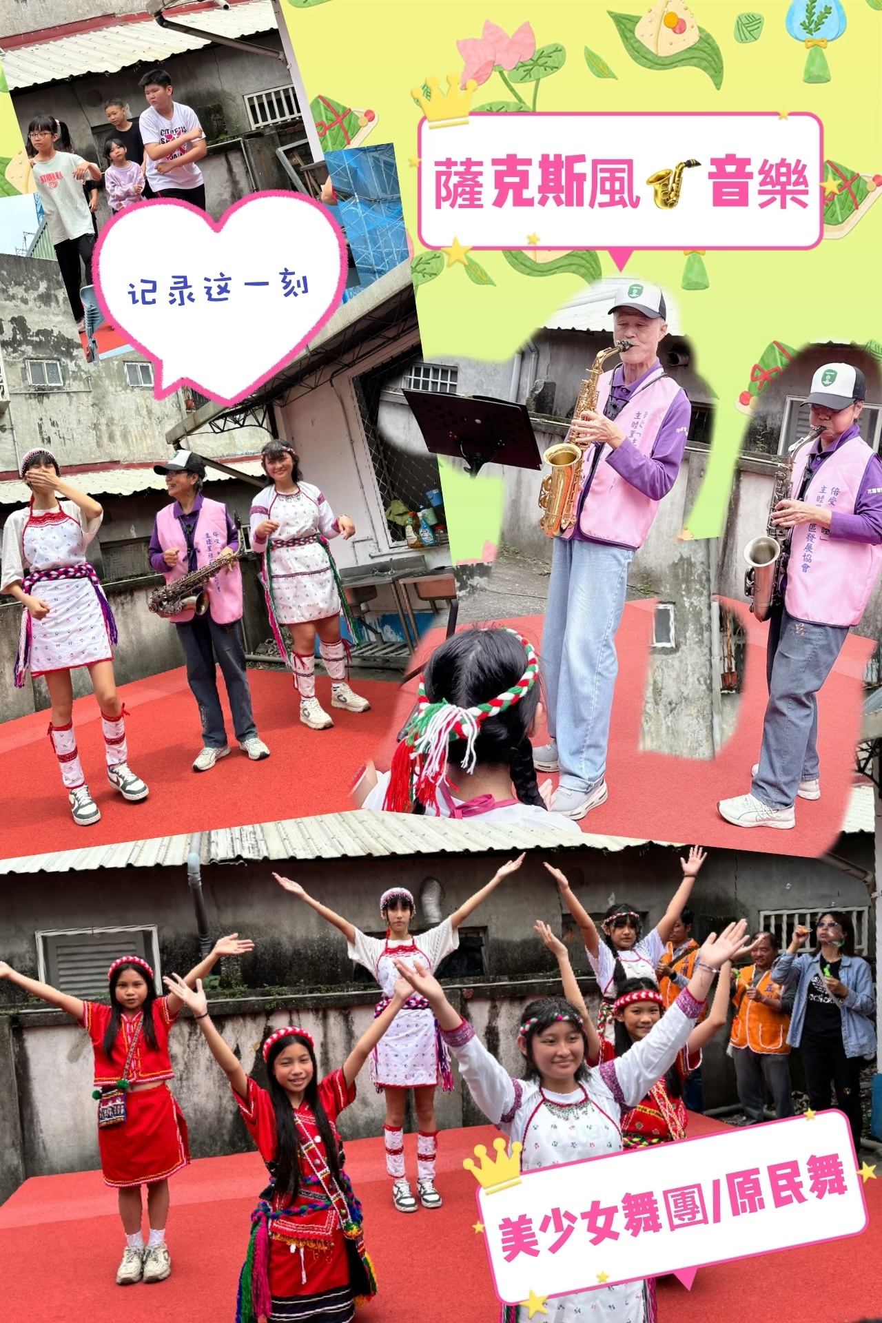 市集中特別邀請薩克斯風老師演出,為活動注入歡樂氛圍,結合原住民兒童與原民少女,以律動歌舞帶動全場,展現出青春、活力與原民文化的魅力。