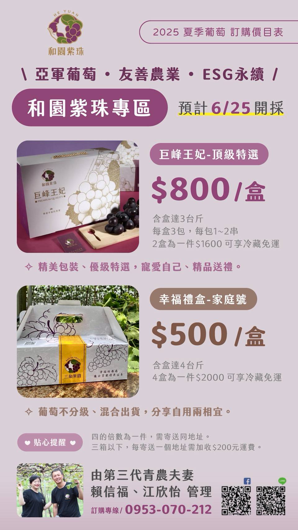 由第三代青農夫妻-賴信福、江欣怡管理,亞軍葡萄、友善永續。