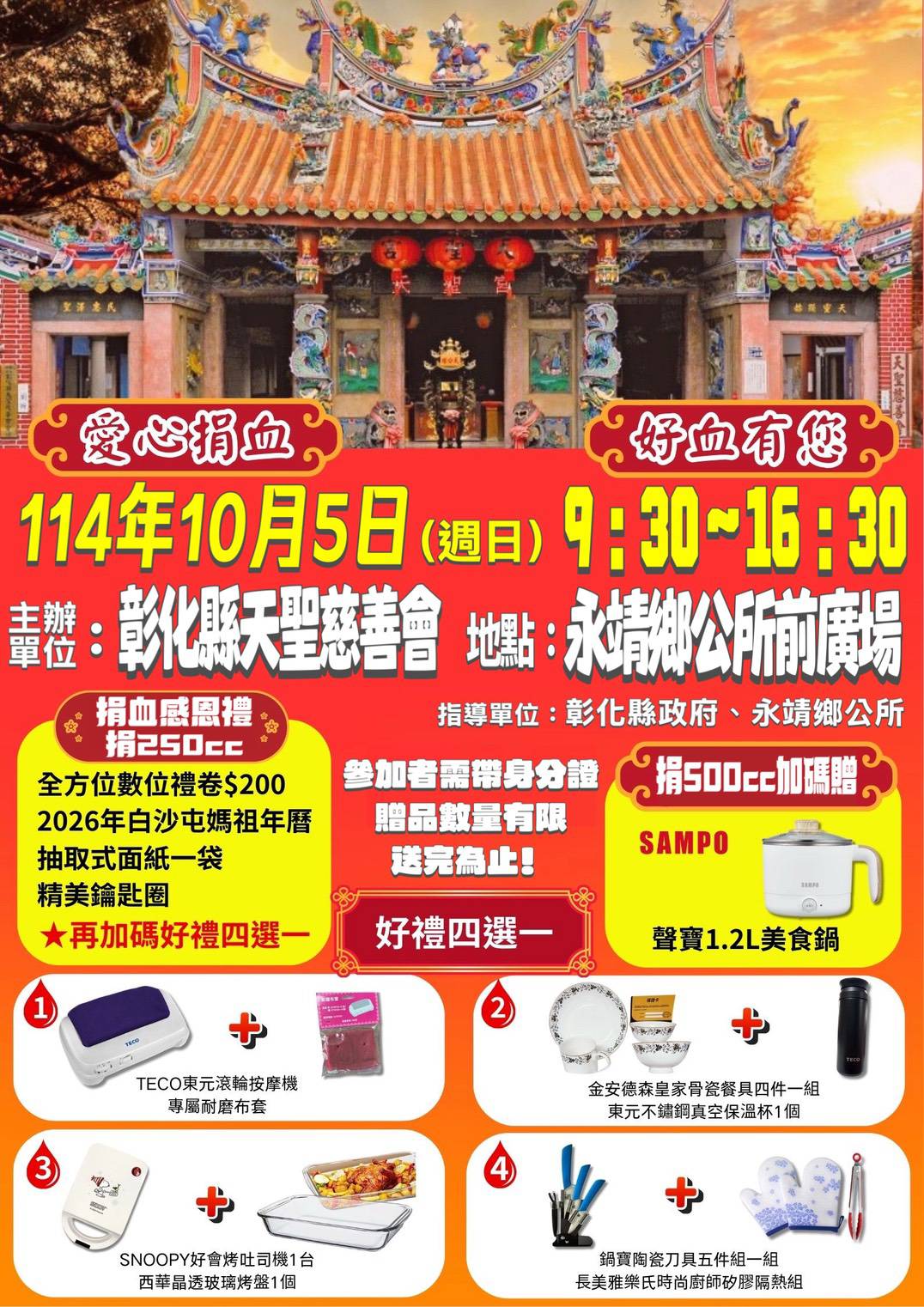 天聖慈善會表示,捐血不僅能幫助急需用血的病患,更是最直接的公益行動。每一袋血,都是對生命的支持與守護。期盼透過本次活動,號召更多熱心人士踴躍響應,讓愛心延續不斷。一袋熱血,一份希望。誠摯邀請大家在10月5日攜手前來,共同為生命加油!